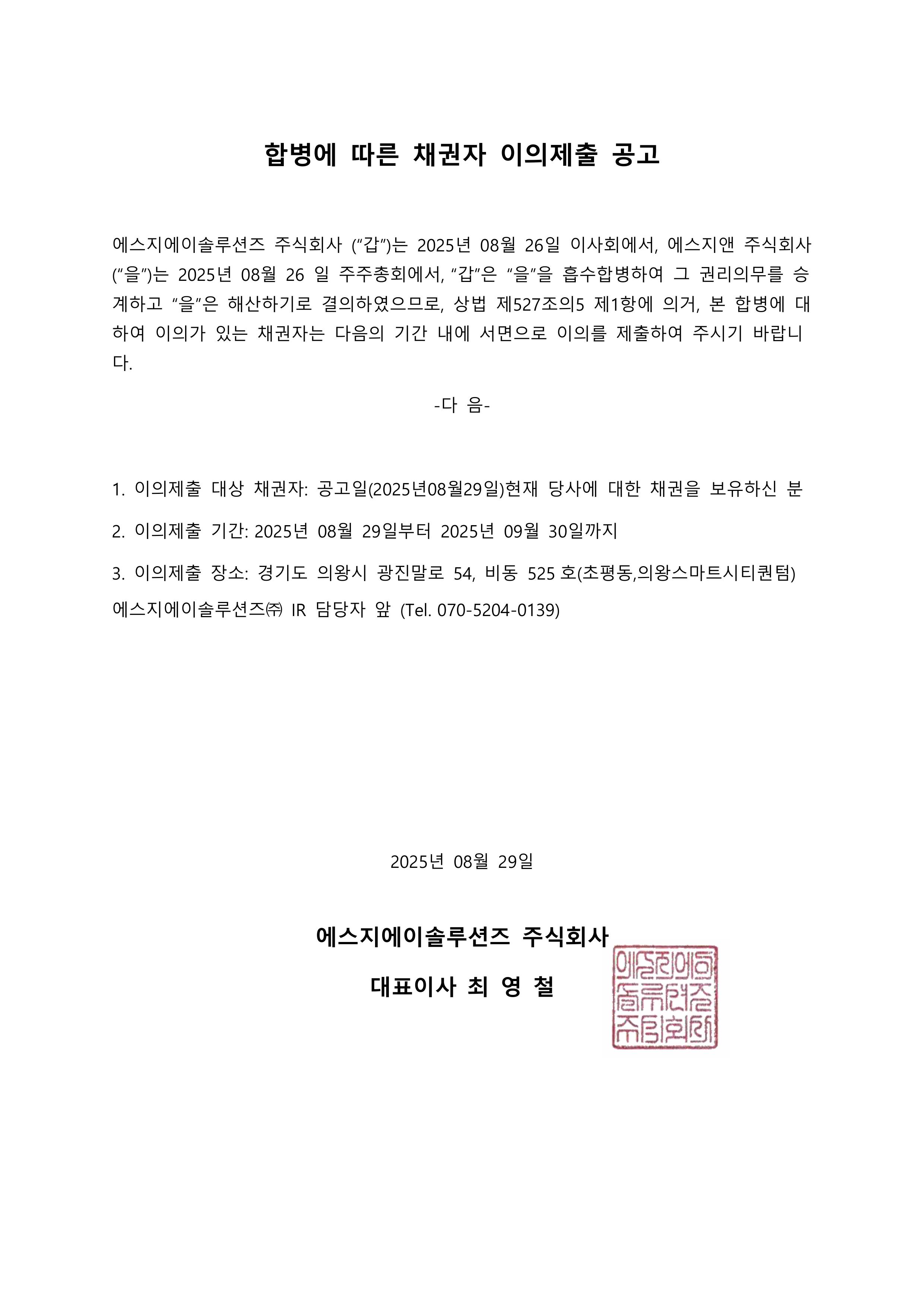 합병에 따른 채권자 이의제출 공고 다운로드 2025-08-29